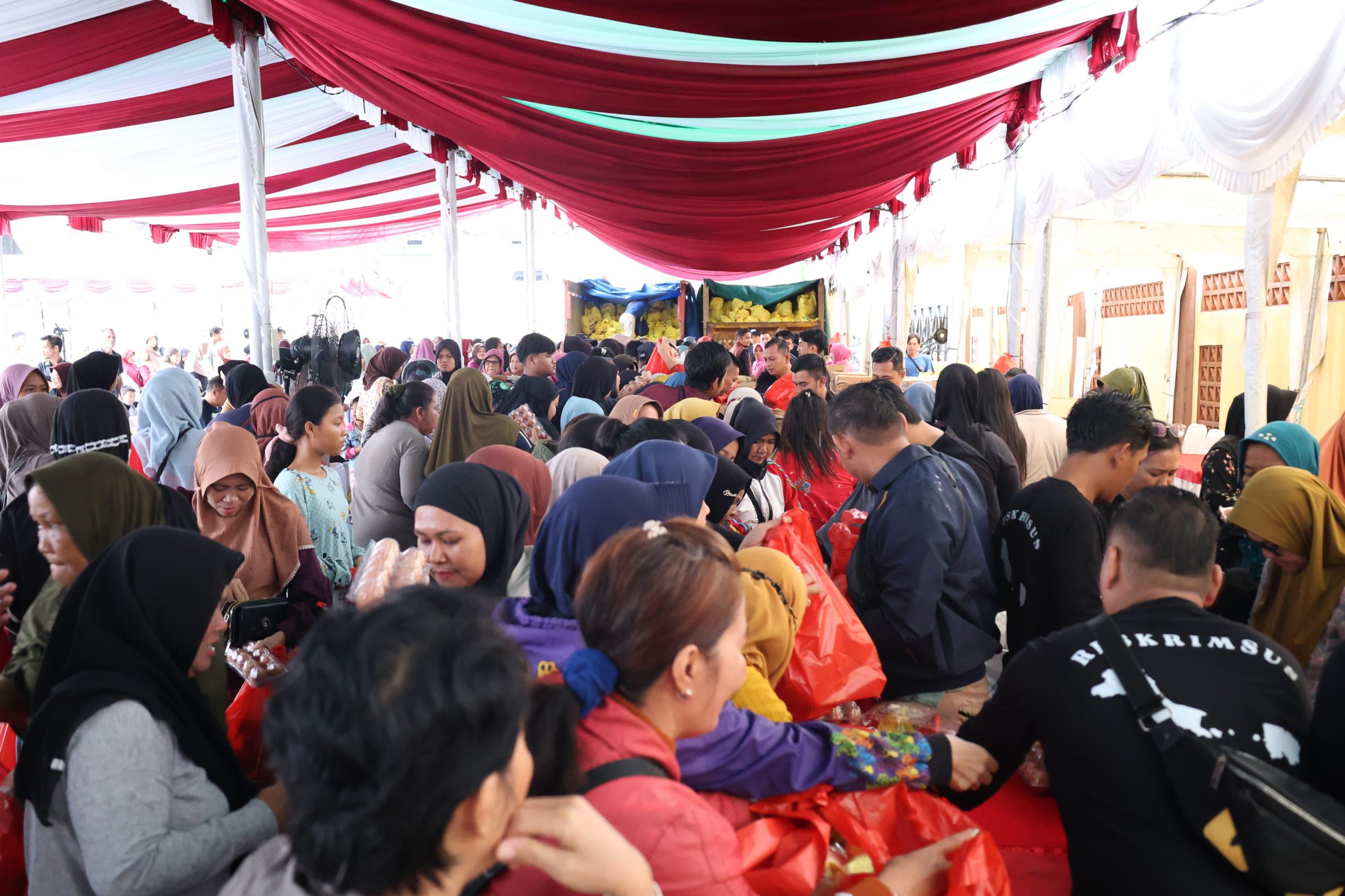 “Hari ini kita melaksanakan bazar murah. Kita menyiapkan 1.000 paket berisikan gula pasir, minyak goreng, ikan kaleng, indomie dan lain-lain. Kalau jual dipasaran, harganya kurang lebih 164 ribu rupiah, namun dijual dibazar ini jadi 100 ribu rupiah,” kata Hendro disela-sela peninjauan bazar murah.