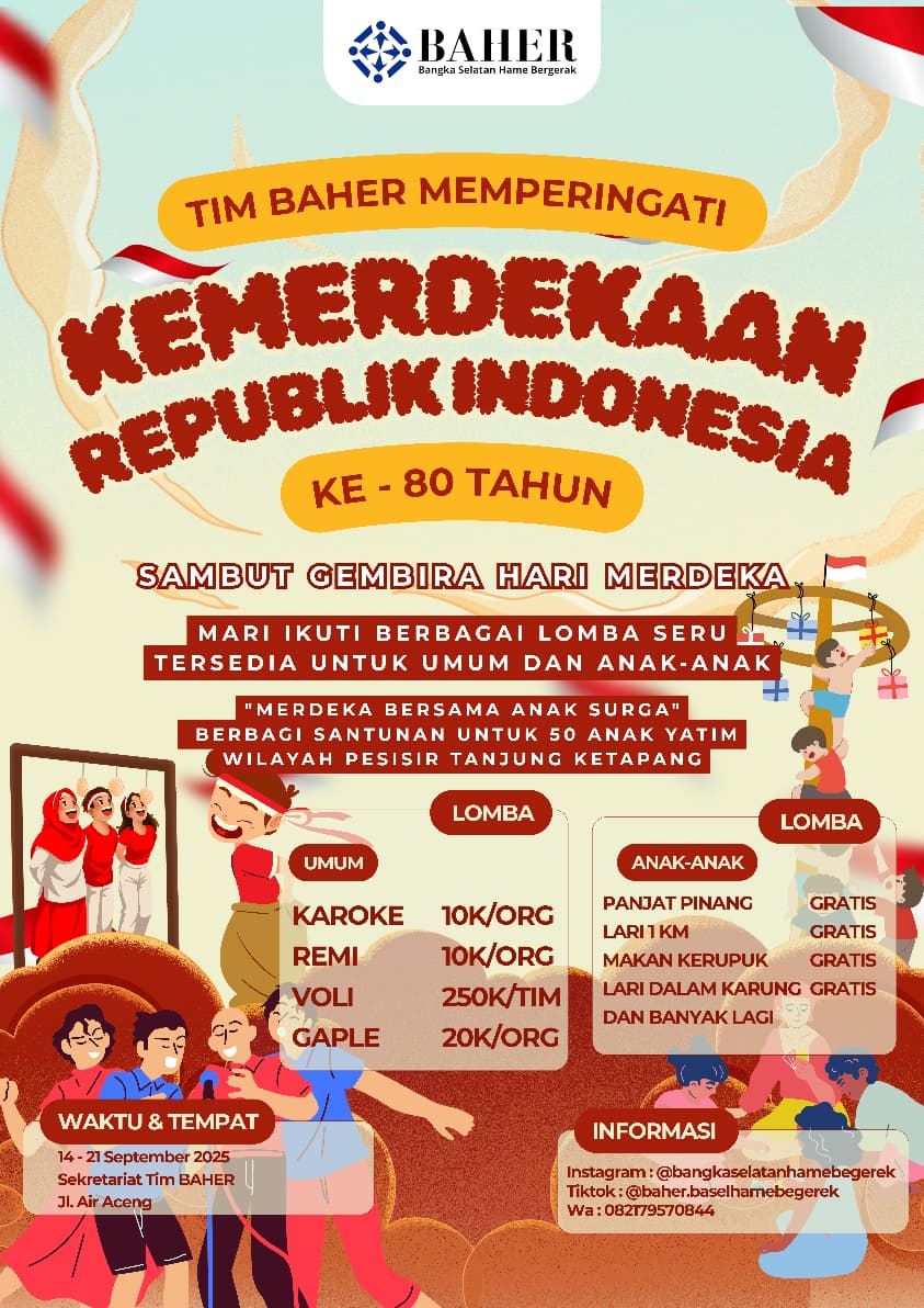 Bangka Selatan, Demokrasibabel – Dalam rangka memperingati Hari Ulang Tahun (HUT) Kemerdekaan Republik Indonesia ke-80, Tim BAHER (Bangka Selatan Hame Bergerak) akan menggelar serangkaian kegiatan meriah yang melibatkan masyarakat umum dan anak-anak. Kegiatan ini berlangsung pada 14–21 September 2025 di Sekretariat Tim BAHER, Jalan Air Aceng Toboali.