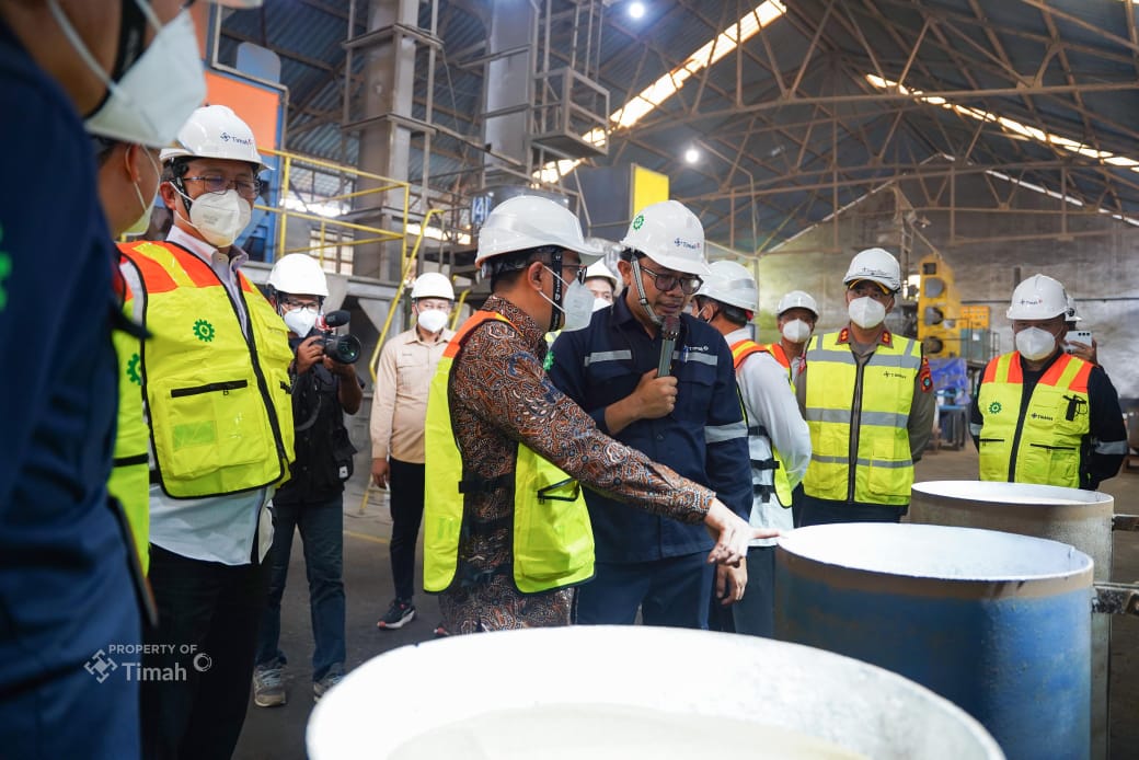 Didampingi Direktur Utama PT Timah Restu Widiyantoro dan Direktur Pengembangan Usaha PT Timah Suhendra Yusuf Ratuprawiranegara melihat langsung proses pemisahan mineral ikutan timah yang dilaksanakan di Amang Plant dan RE(OH) Tanjung Ular.