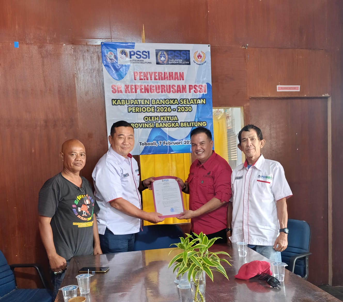 Demokrasibabel – Felly Husaini resmi menjabat sebagai Ketua PSSI Bangka Selatan periode 2026-2030 setelah menerima SK Kepengurusan langsung dari Ketua PSSI Babel di Ruang Rapat KONI Basel