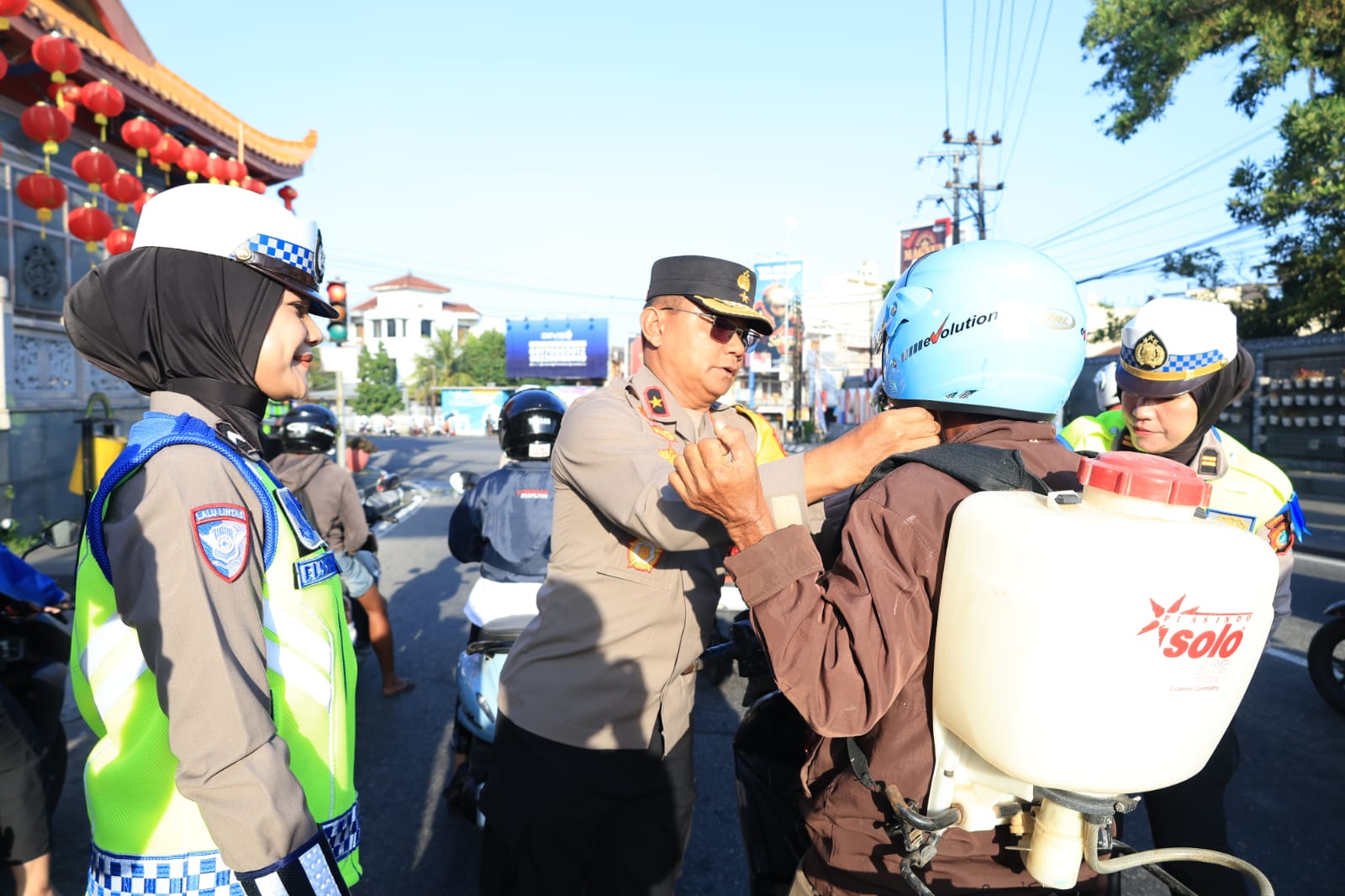 “Kita beri cokelat kepada pengendara yang tertib. Kalau ada anak-anak yang dibonceng tidak pakai helm, kita pasangkan juga helm,” ujarnya.