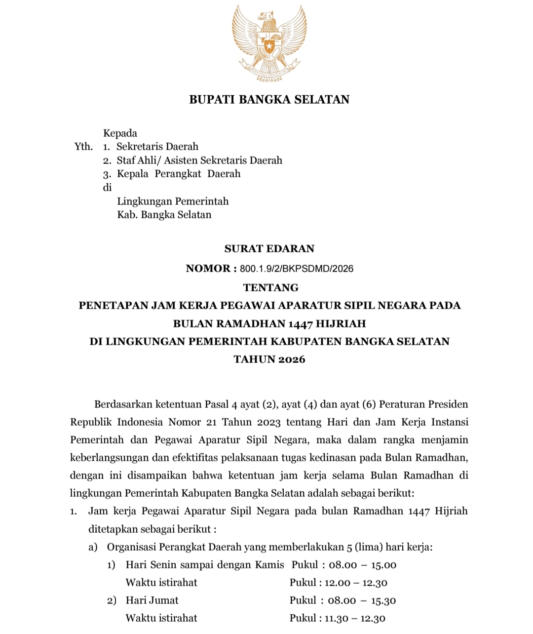 Surat edaran tersebut telah ditandatangani secara elektronik dan berlaku selama Bulan Ramadhan 1447 Hijriah di lingkungan Pemerintah Kabupaten Bangka Selatan.