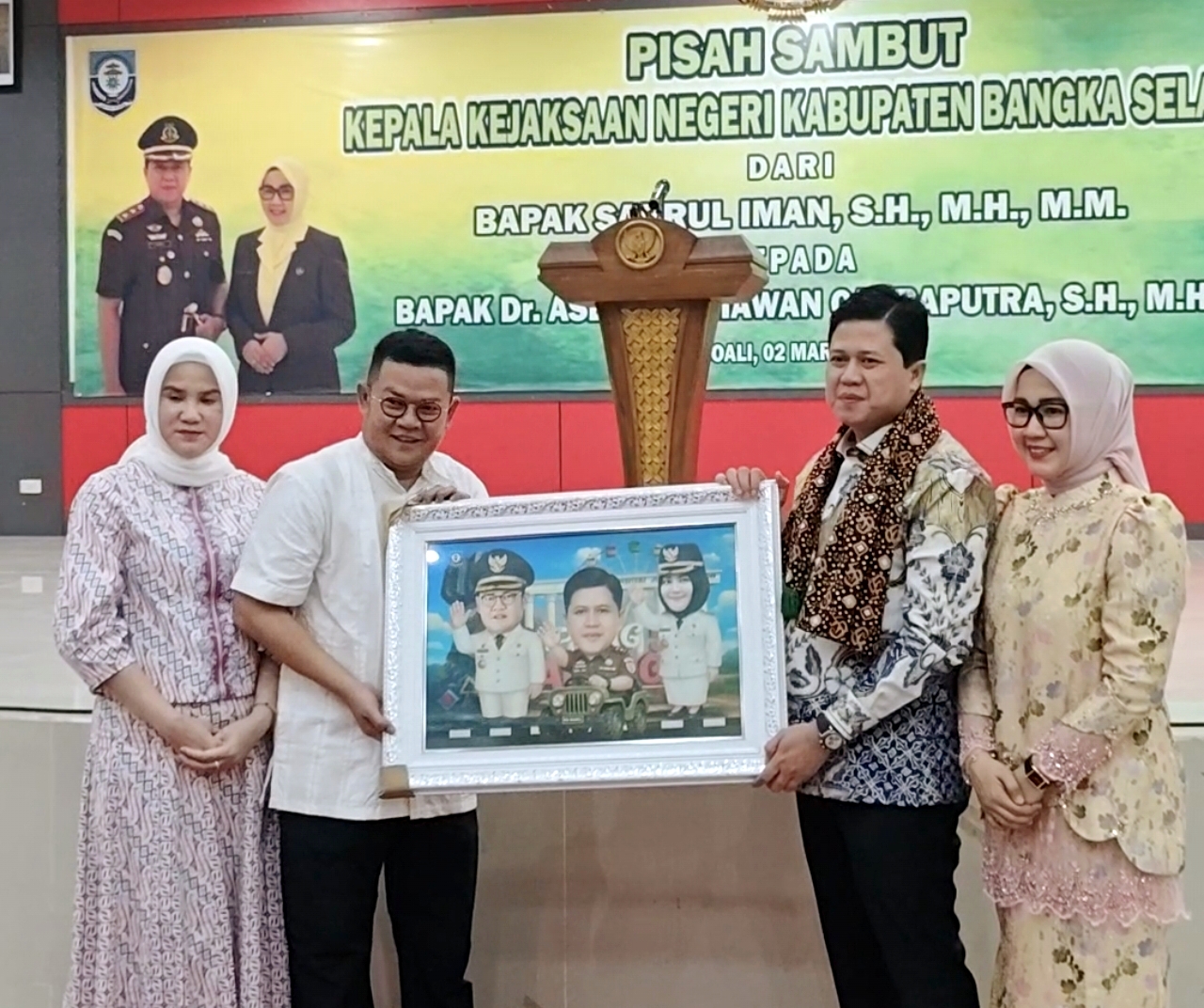 Toboali, Demokrasibabel – Pemerintah Kabupaten Bangka Selatan menggelar acara pisah sambut Kepala Kejaksaan Negeri Bangka Selatan dari Sabrul Iman, S.H., M.H., M.M., beserta Ketua Ikatan Adhyaksa Dharma Karini (IAD) Wilayah Kabupaten Bangka Selatan, Ibu Winadya Martha Sari, kepada Dr. Asep Kurniawan Cakraputra, S.H., M.H., selaku Kepala Kejaksaan Negeri Bangka Selatan yang baru, serta Ketua IAD Wilayah Kabupaten Bangka Selatan, Ibu Srie Indah Wahyuni. Acara digelar di Gedung Serbaguna Pemkab Bangka Selatan, Senin (2/3/2026) malam.