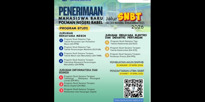 Sungailiat, Demokrasibabel – Politeknik Manufaktur Negeri Bangka Belitung (Polman Babel) kembali membuka kesempatan bagi lulusan SMA/SMK/MA untuk melanjutkan pendidikan melalui jalur Seleksi Nasional Berdasarkan Tes (SNBT) tahun 2026. Pendaftaran resmi dibuka mulai 25 Maret hingga 7 April 2026.